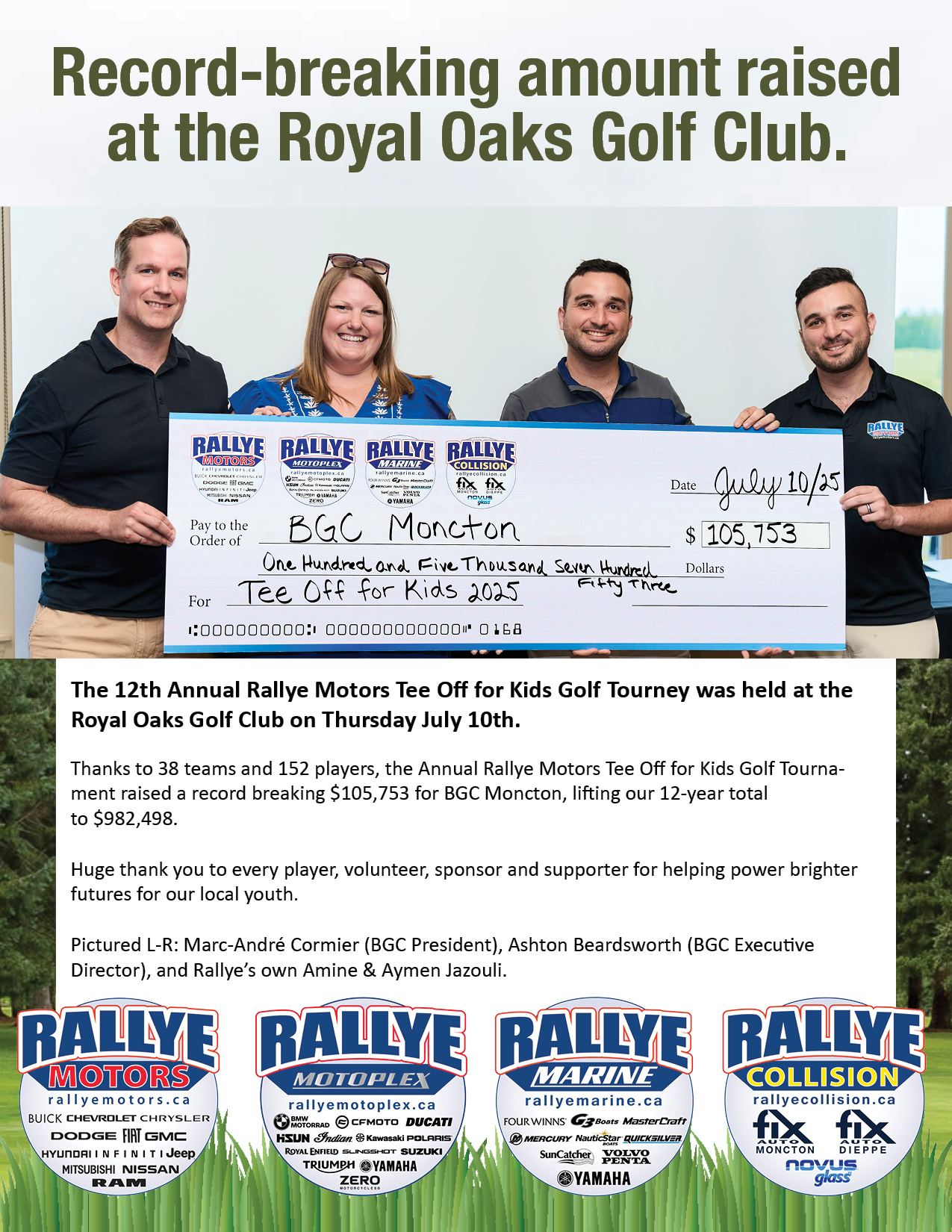 Rallye Raises More Than $982,498 for the Boys and Girls Club of Moncton in 12 short years. We wouldn't be able to do it without YOU, our sponsors, donors, golfers & volunteers. You make a difference in the lives of many kids in our community. Thank you!
