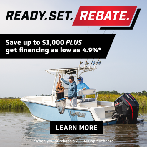 Our Ready. Set. Rebate. offer gives you two great ways to save this fall when you upgrade your boat with a new Mercury 2.5-400hp outboard. Now through November 30, 2025, you can get up to $1,000 off the purchase price plus financing rates as low as 4.9% when you buy a new Mercury outboard replace the engine on your existing boat.